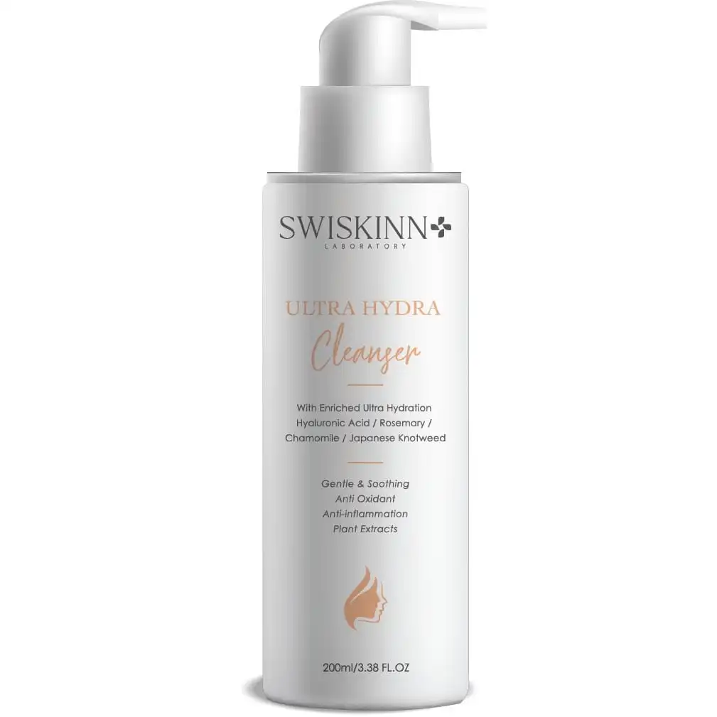 SWISKINN Ultra Hydra Cleanser designed to effectively eliminate dirt, oil and makeup while keeping the skin natural protective barrier and retaining moisture.